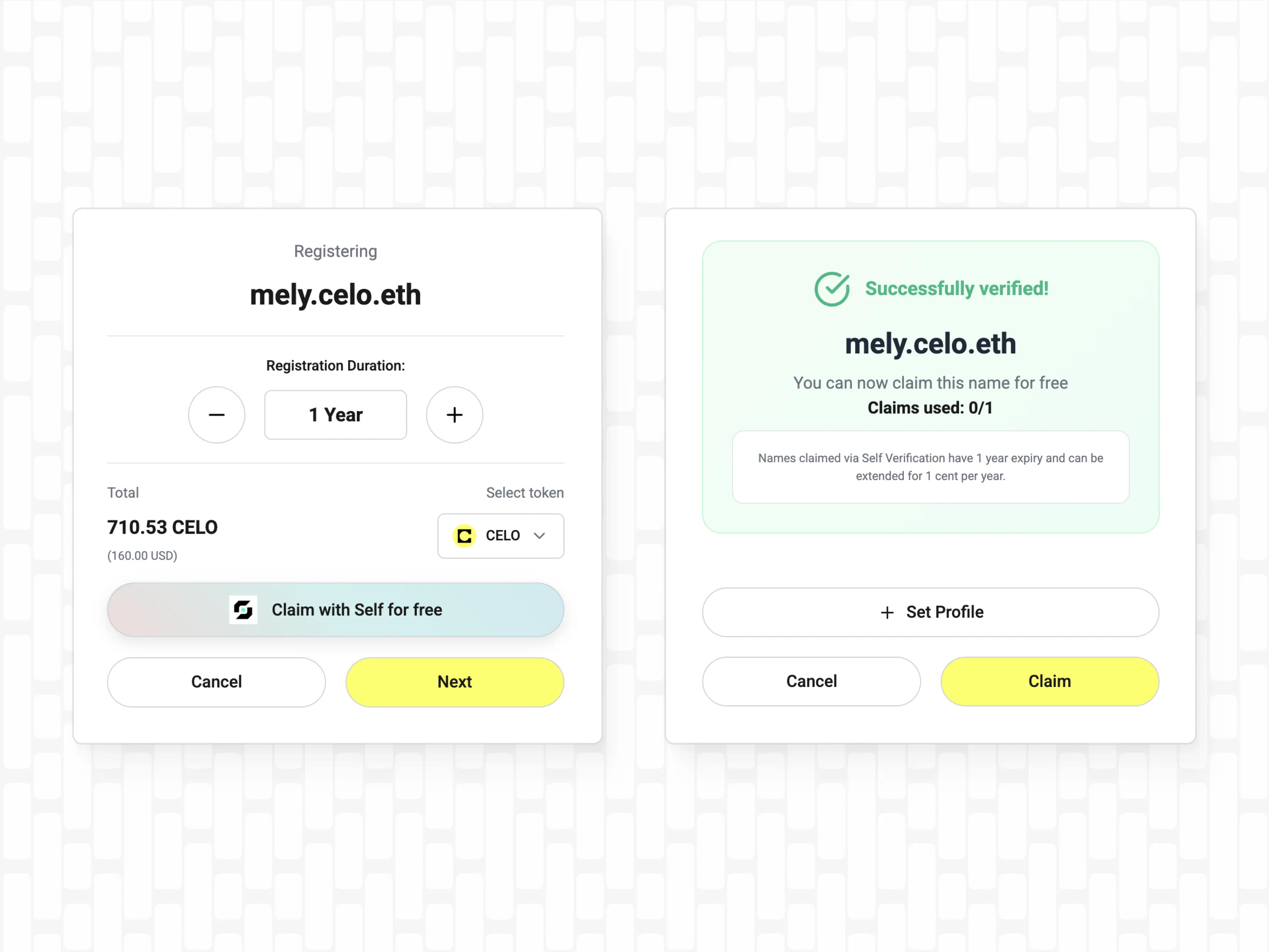 For users that are verified with Self, a name registration will effectively be near‑free at $0.01/year.